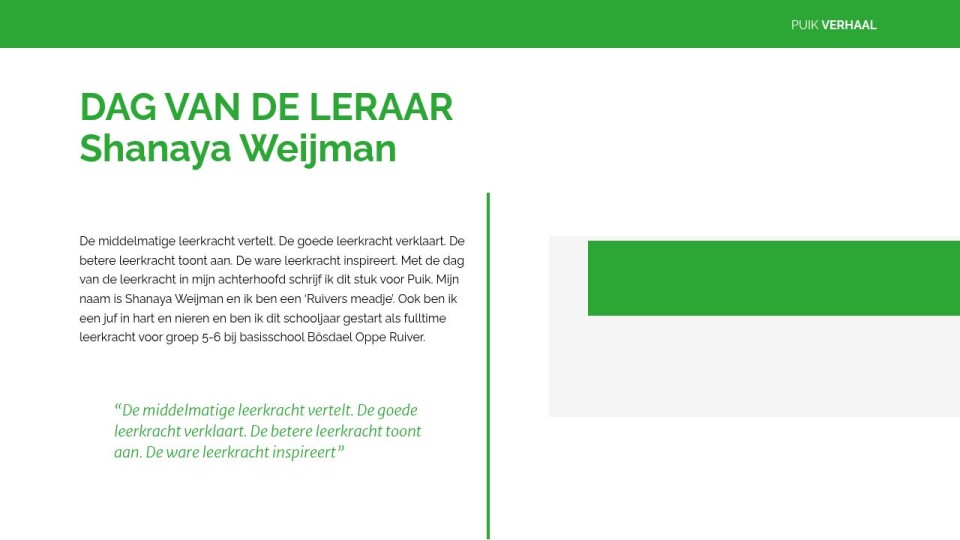 De middelmatige leerkracht vertelt. De goede leerkracht verklaart. De betere leerkracht toont aan. De ware leerkracht inspireert. Met de dag van de leerkracht in mijn achterhoofd schrijf ik dit stuk voor Puik. Mijn naam is Shanaya Weijman en ik ben een ‘Ruivers meadje’. Ook ben ik een juf in hart en nieren en ben ik dit schooljaar gestart als fulltime leerkracht voor groep 5-6 bij basisschool Bösdael Oppe Ruiver.