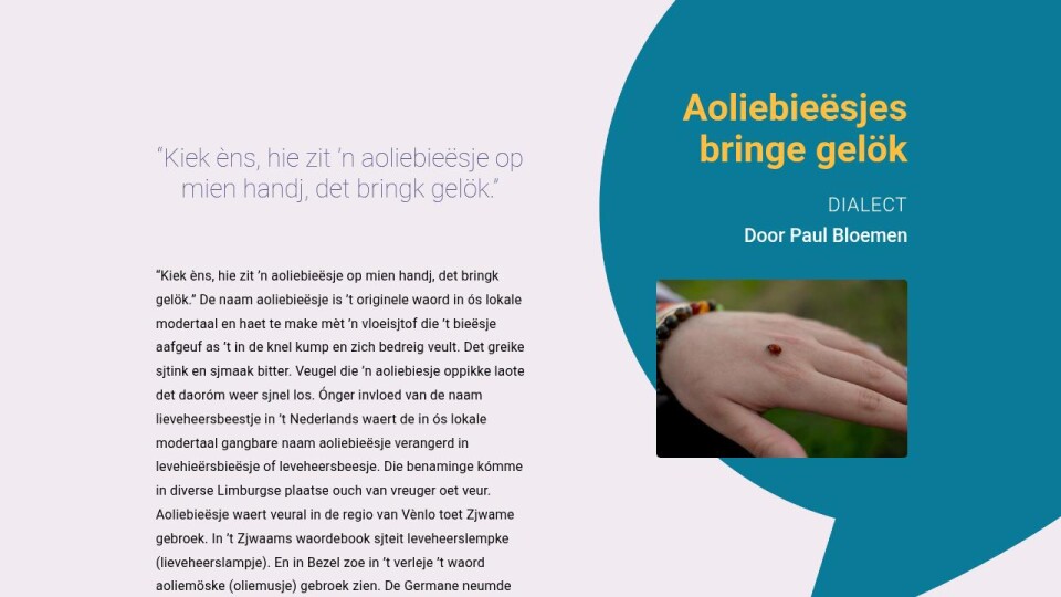 “Kiek èns, hie zit ’n aoliebieësje op mien handj, det bringk gelök.” De naam aoliebieësje is ’t originele waord in ós lokale modertaal en haet te make mèt ’n vloeisjtof die ’t bieësje aafgeuf as ’t in de knel kump en zich bedreig veult. Det greike sjtink en sjmaak bitter. Veugel die ’n aoliebiesje oppikke laote det daoróm weer sjnel los. Ónger invloed van de naam lieveheersbeestje in ’t Nederlands waert de in ós lokale modertaal gangbare naam aoliebieësje verangerd in levehieërsbieësje of leveheersbeesje. Die benaminge kómme in diverse Limburgse plaatse ouch van vreuger oet veur. Aoliebieësje waert veural in de regio van Vènlo toet Zjwame gebroek. In ’t Zjwaams waordebook sjteit leveheerslempke (lieveheerslampje). En in Bezel zoe in ’t verleje ’t waord aoliemöske (oliemusje) gebroek zien. De Germane neumde det kaeverke ‘Freyafugle’, letterlijk vertaald ‘vogel van Freya’. Freya waar de godin van ó.a. de vruchbaarheid en de leefde. De christene vormde dae ‘heidense’ Germaanse naam Freyafugle óm en gebroekde daobie ‘ne naam oet de christelike religie wie ‘Onze Lieve Heer’ en ‘Onze Lieve Vrouw’. Zoeë zien de name ‘onzelieveheersbeestje’ of ‘onzelievevrouwebeestje’ óntsjtange. In ’t dageliks taalgebroek waere de kortere vorme lieveheersbeestjes en lievevrouwebeestjes gebroek. In ’t Limburgs kump de vrouwelike variant levevrouwebeesje veural in Belgisch-Limburg veur. Volges ’t volksgeluif bringe aoliebieësjes gelök, leefde én good waer. En ’t zien nuttige bieësjes, ze besjerme plante door ’t aete van blaadluus en angere sjaajlike insecte.