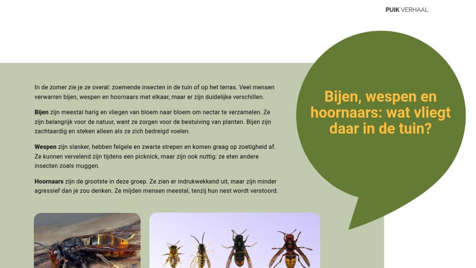 In de zomer zie je ze overal: zoemende insecten in de tuin of op het terras. Veel mensen verwarren bijen, wespen en hoornaars met elkaar, maar er zijn duidelijke verschillen.