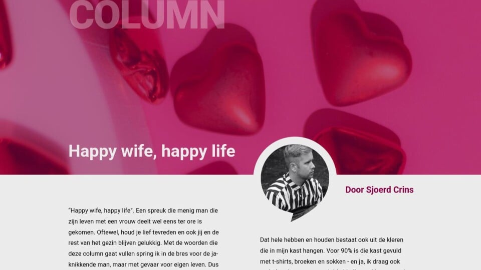 “Happy wife, happy life”. Een spreuk die menig man die zijn leven met een vrouw deelt wel eens ter ore is gekomen. Oftewel, houd je lief tevreden en ook jij en de rest van het gezin blijven gelukkig. Met de woorden die deze column gaat vullen spring ik in de bres voor de ja-knikkende man, maar met gevaar voor eigen leven. Dus bij deze wil ik graag een moment nemen om u als lezer en vooral vriendinlief te laten weten dat ik verzot op haar ben en dat ik met mijn hele hebben en houden van haar hou.