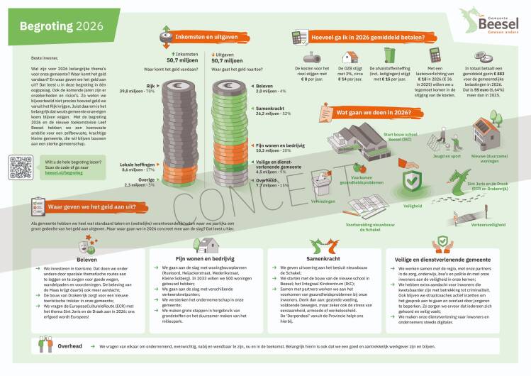 In de meerjarenbegroting 2026 staan de financiële-, bedrijfsmatige- en beleidsmatige acties en ambities van de gemeente Beesel voor het begrotingsjaar 2026. De eerste jaren van de begroting hebben een positief saldo. Vanaf 2028 is er nog steeds geen structurele oplossing vanuit het Rijk voor de tekorten op onze wettelijke taken. Hierdoor laten we voor dat jaar een klein negatief begrotingssaldo zien. We vertrouwen erop dat het Rijk dit alsnog rechtzet. Tegelijkertijd blijven we lokaal actief sturen op een gezonde en krachtige koers voor onze gemeente.