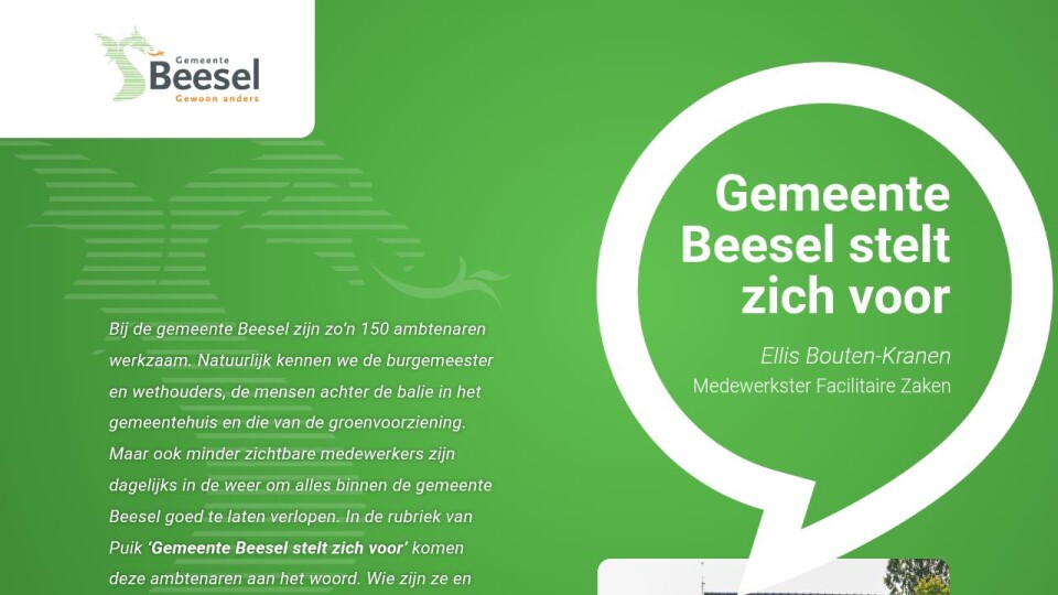 Bij de gemeente Beesel zijn zo’n 150 ambtenaren werkzaam. Natuurlijk kennen we de burgemeester en wethouders, de mensen achter de balie in het gemeentehuis en die van de groenvoorziening. Maar ook minder zichtbare medewerkers zijn dagelijks in de weer om alles binnen de gemeente Beesel goed te laten verlopen. In de rubriek van Puik ‘Gemeente Beesel stelt zich voor’ komen deze ambtenaren aan het woord. Wie zijn ze en wat doen ze precies? En waarom zijn ze bij de gemeente Beesel gaan werken? In het tiende deel is het de beurt aan Ellis Bouten-Kranen. Zij is al ruim twintig jaar medewerkster Facilitaire Zaken bij de gemeente Beesel.