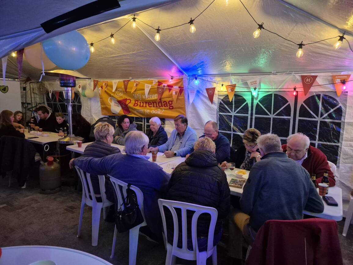 Samen met een groep buurtgenoten hebben we de Burendag voorbereid en ’s morgens hebben we alles samen opgebouwd, wat de sfeer van verbondenheid versterkte nog vóór het echte feest begon. ’s Avonds werd ook weer gezamenlijk opgeruimd.