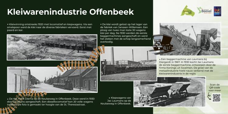 In Reuver en Offenbeek staan nu zes nieuwe informatieborden over de rijke geschiedenis van de greswarenindustrie. Ze vertellen het verhaal van de kleiwinning tot aan de fabrieken en het transport naar de afnemers in Nederland en in de omringende landen. Het geheel is te bewonderen langs het nieuwe pad tussen het dorpsplein en de Offenbekermarkt, compleet met originele tuf en kleiwagon. Deze week bord 2 van 6 met als onderwerp transport van de klei naar de fabriek.