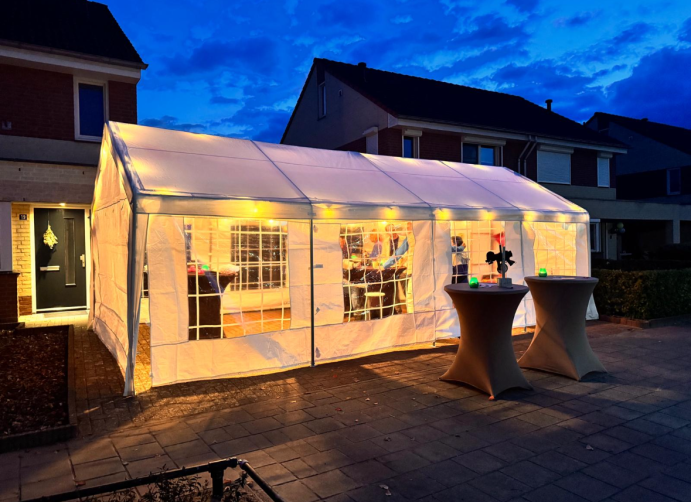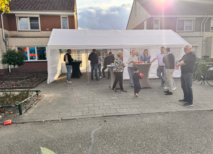 Om 11.00 uur kwamen we bij elkaar om de weg af te zetten en de tent op te bouwen. Het was inmiddels het vierde jaar dat we de Burendag organiseerden. Dankzij de routine verliep alles soepel en stonden de tent en tafels binnen een uur klaar.