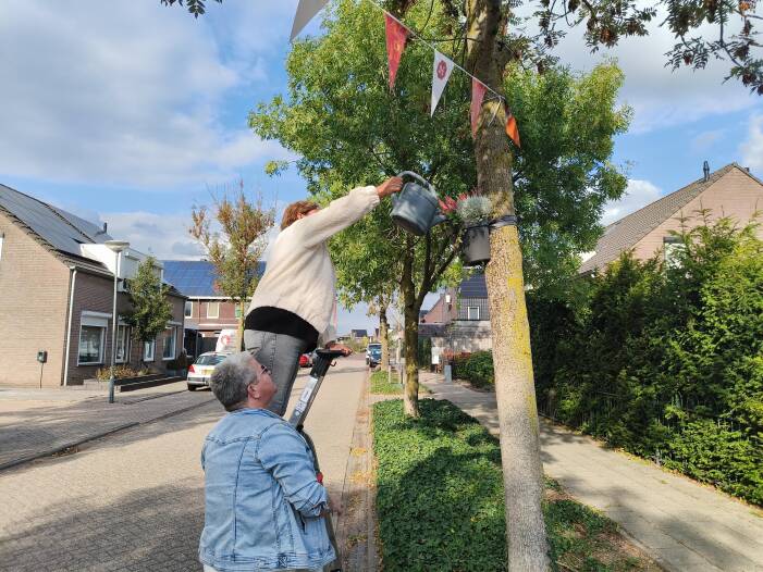 De straatjes stonden in volle bloei: opgefleurd, opgeladen en opgevrolijkt en dat allemaal dankzij de goede, gezellige samenwerking. Mens én dier kunnen nu genieten van deze bonte bloemenparade!