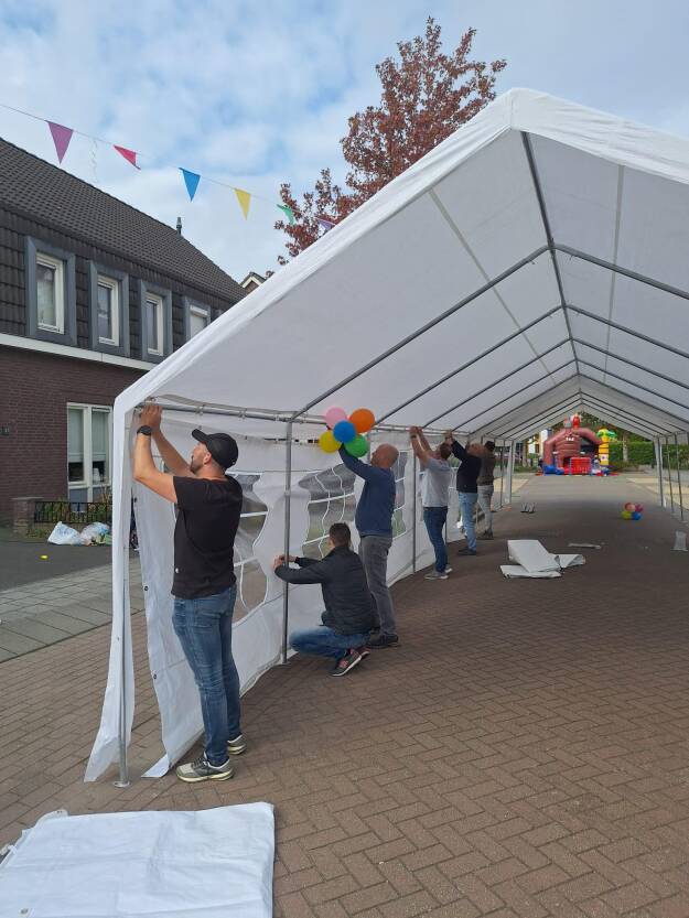 Nadat aan de voorkant de vergunning was geregeld bij de gemeente, de financiële bijdragen van het Oranjefonds en Kernoverleg waren aangevraagd konden we aan de slag gaan. Ook dit jaar hebben we ervoor gezorgd dat alle buurtgenoten mee konden doen zonder een eigen bijdrage te hoeven vragen. Alleen voor de drankjes, buiten koffie, thee, ranja en water, moest iedereen zelf zorgen. ’s Ochtends om 10.00 uur begonnen we met een tent opzetten en hier kregen we al hulp van voldoende buurtgenoten. Ook werd het springkussen in de ochtend gebracht en uitgeprobeerd.