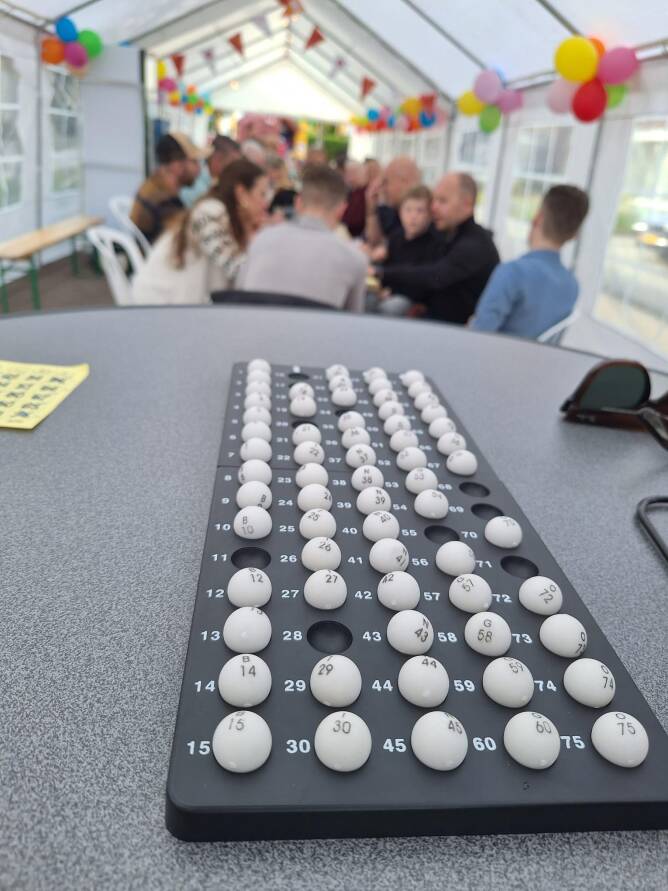 ’s Avonds ging het feest verder met een gezamenlijk avondprogramma, waarin buurtgenoten konden genieten van een heerlijke frietmaaltijd en een feestelijke muzikale afsluiting. De muzikale bingo-quiz zorgde voor spanning, lachmomenten en veel interactie tussen de deelnemers.