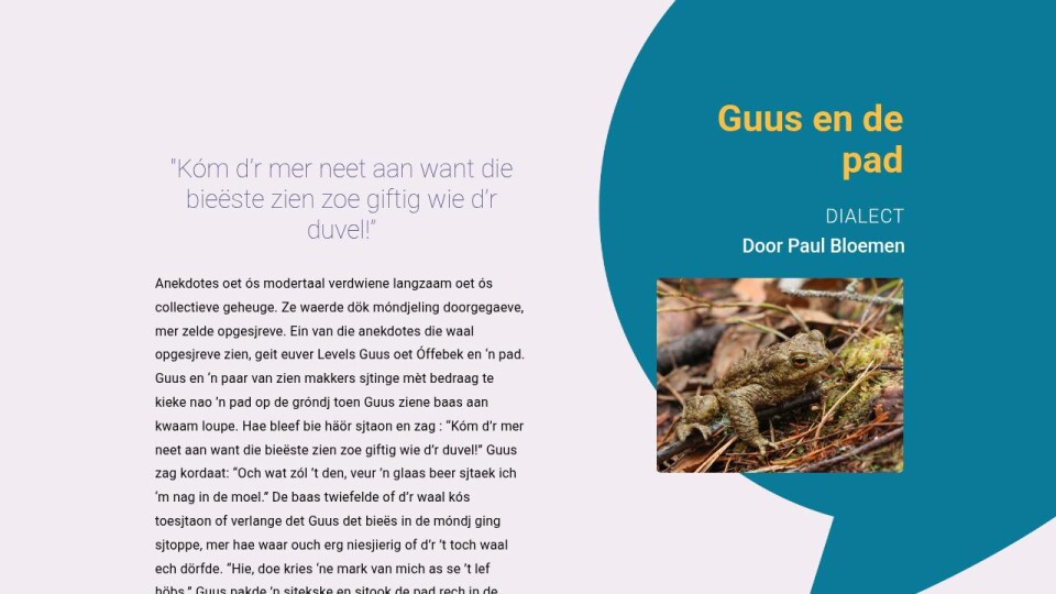 Anekdotes oet ós modertaal verdwiene langzaam oet ós collectieve geheuge. Ze waerde dök móndjeling doorgegaeve, mer zelde opgesjreve. Ein van die anekdotes die waal opgesjreve zien, geit euver Levels Guus oet Óffebek en ‘n pad. Guus en ‘n paar van zien makkers sjtinge mèt bedraag te kieke nao ’n pad op de gróndj toen Guus ziene baas aan kwaam loupe. Hae bleef bie häör sjtaon en zag : “Kóm d’r mer neet aan want die bieëste zien zoe giftig wie d’r duvel!” Guus zag kordaat: “Och wat zól ’t den, veur ’n glaas beer sjtaek ich ‘m nag in de moel.” De baas twiefelde of d’r waal kós toesjtaon of verlange det Guus det bieës in de móndj ging sjtoppe, mer hae waar ouch erg niesjierig of d’r ’t toch waal ech dörfde. “Hie, doe kries ‘ne mark van mich as se ’t lef höbs.” Guus pakde ’n sjtekske en sjtook de pad rech in de moel en zag triomfantelik: “Höb ich ‘m noe in de moel gesjtaoke of neet?” En hae sjtook zich ‘t geldsjtök dankbaar in de tes.