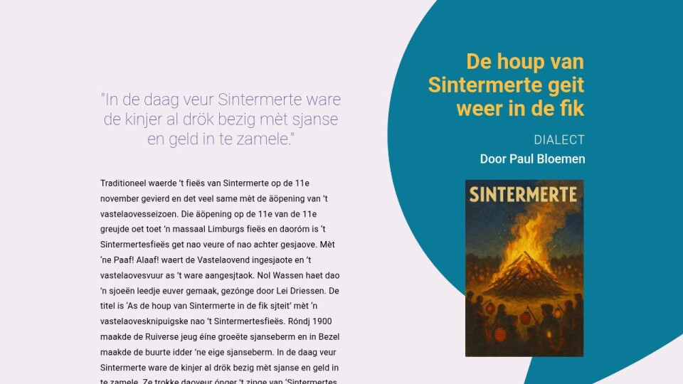Traditioneel waerde ’t fieës van Sintermerte op de 11e november gevierd en det veel same mèt de äöpening van ’t vastelaovesseizoen. Die äöpening op de 11e van de 11e greujde oet toet ’n massaal Limburgs fieës en daoróm is ‘t Sintermertesfieës get nao veure of nao achter gesjaove. Mèt ‘ne Paaf! Alaaf! waert de Vastelaovend ingesjaote en ’t vastelaovesvuur as ’t ware aangesjtaok. Nol Wassen haet dao ’n sjoeën leedje euver gemaak, gezónge door Lei Driessen. De titel is ‘As de houp van Sintermerte in de fik sjteit’ mèt ‘n vastelaovesknipuigske nao ’t Sintermertesfieës. Róndj 1900 maakde de Ruiverse jeug éíne groeëte sjanseberm en in Bezel maakde de buurte idder ’ne eige sjanseberm. In de daag veur Sintermerte ware de kinjer al drök bezig mèt sjanse en geld in te zamele. Ze trokke daoveur ónger ’t zinge van ‘Sintermertes veugelke’ mèt ‘n extra baedelcouplet, langs alle huzer. As emes nieks goof zónge de kinjer keihel ’n sjpeciaal couplet euver gietzigheid. Dialectsjriever Jos Bergmans, dae oppe Ruiver opgreujde, haet dao ’n sjoeën dialectverhaol euver gesjreve, truuk te vinje in ‘t jaorbook nr. 6 oet 1986 van Heemkundevereniging Maas- en Swalmdal. De titel is ‘Veur fieërtig jaor ’n Ruivers Sintermertesfieës’, ‘ne truukblik op Jos ziene Ruiverse jeugtied. Haopelik geit de Sintermerteshoup nag jaorelang in de fik en hèlt Sintermerte de Halloweenhekse op aafsjtandj.