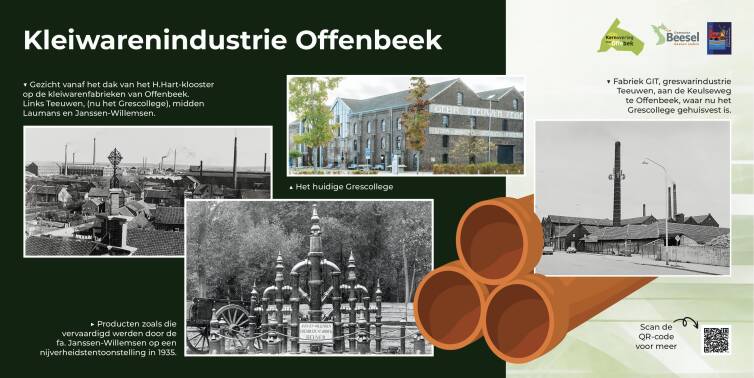 In Reuver en Offenbeek staan nu zes nieuwe informatieborden over de rijke geschiedenis van de greswarenindustrie. Ze vertellen het verhaal van de kleiwinning tot aan de fabrieken en het transport naar de afnemers in Nederland en in de omringende landen. Het geheel is te bewonderen langs het nieuwe pad tussen het dorpsplein en de Offenbekermarkt, compleet met originele tuf en kleiwagon. Deze week bord 5 van 6 met als onderwerp de fabrieken.