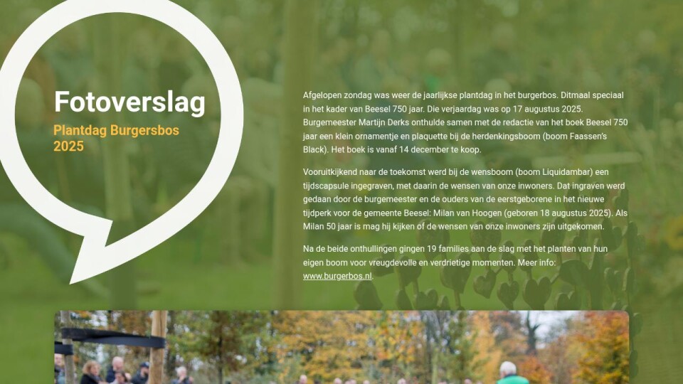 Afgelopen zondag was weer de jaarlijkse plantdag in het burgerbos. Ditmaal speciaal in het kader van Beesel 750 jaar. Die verjaardag was op 17 augustus 2025. Burgemeester Martijn Derks onthulde samen met de redactie van het boek Beesel 750 jaar een klein ornamentje en plaquette bij de herdenkingsboom (boom Faassen’s Black). Het boek is vanaf 14 december te koop.