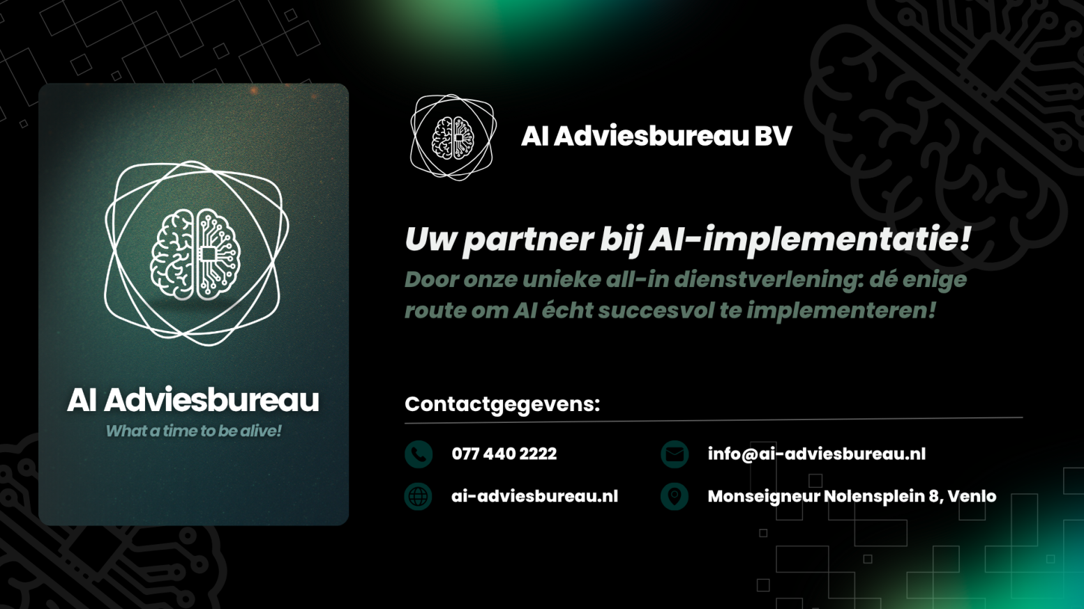 Ben je ondernemer of werkzaam binnen een organisatie waar AI steeds vaker wordt ingezet? Dan bieden we een inspirerende kennismakingssessie. Deze inspiratiesessie duurt ongeveer 1,5 uur en er mogen meerdere collega’s aansluiten. We laten veel demo's zien, we zoomen in op vraagstukken en toepassingen uit jullie sector en laten direct zien hoe AI daar een oplossing kan bieden. Ook ontvangen jullie informatie van ons over hoe je AI in 2026 nou echt goed kunt implementeren binnen jullie organisatie en waar je moet beginnen. Kijk voor meer informatie en het aanvragen van deze kennismaking op: www.ai-adviesbureau.nl/ai-2026.