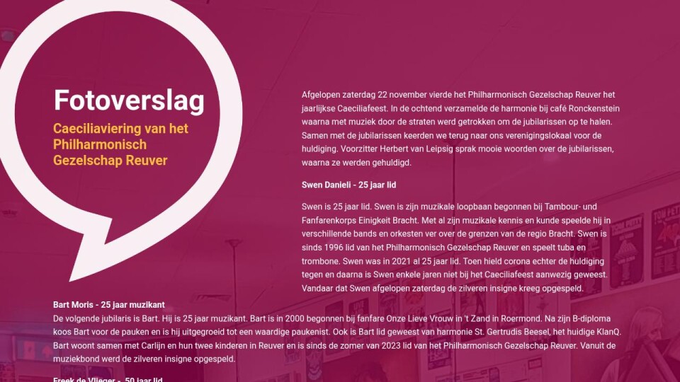 Afgelopen zaterdag 22 november vierde het Philharmonisch Gezelschap Reuver het jaarlijkse Caeciliafeest. In de ochtend verzamelde de harmonie bij café Ronckenstein waarna met muziek door de straten werd getrokken om de jubilarissen op te halen. Samen met de jubilarissen keerden we terug naar ons verenigingslokaal voor de huldiging. Voorzitter Herbert van Leipsig sprak mooie woorden over de jubilarissen, waarna ze werden gehuldigd.