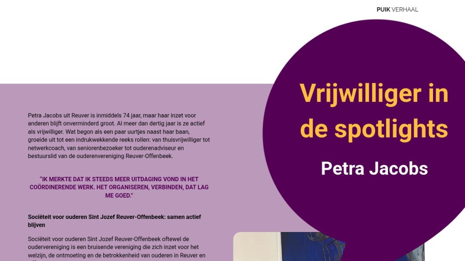 Petra Jacobs uit Reuver is inmiddels 74 jaar, maar haar inzet voor anderen blijft onverminderd groot. Al meer dan dertig jaar is ze actief als vrijwilliger. Wat begon als een paar uurtjes naast haar baan, groeide uit tot een indrukwekkende reeks rollen: van thuisvrijwilliger tot netwerkcoach, van seniorenbezoeker tot ouderenadviseur en bestuurslid van de ouderenvereniging Reuver-Offenbeek.