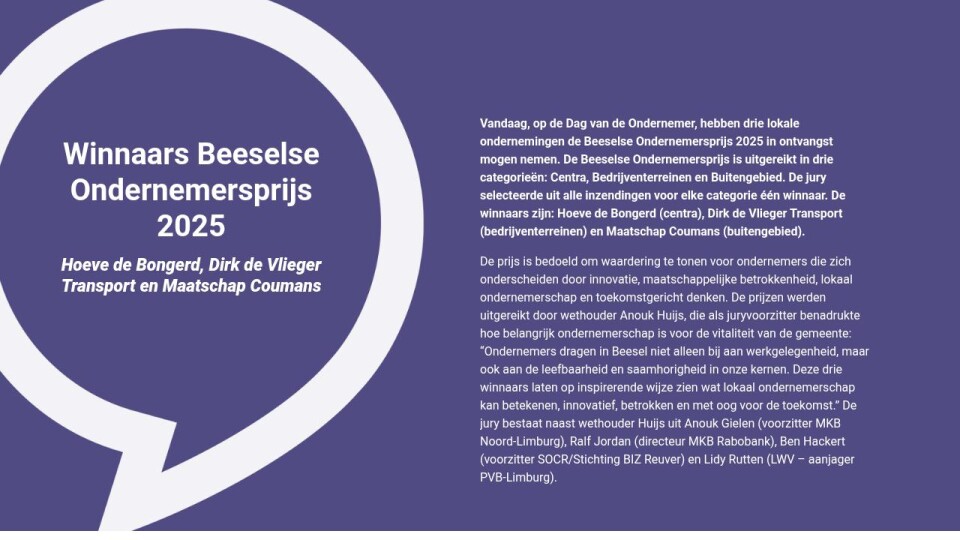 Vandaag, op de Dag van de Ondernemer, hebben drie lokale ondernemingen de Beeselse Ondernemersprijs 2025 in ontvangst mogen nemen. De Beeselse Ondernemersprijs is uitgereikt in drie categorieën: Centra, Bedrijventerreinen en Buitengebied. De jury selecteerde uit alle inzendingen voor elke categorie één winnaar. De winnaars zijn: Hoeve de Bongerd (centra), Dirk de Vlieger Transport (bedrijventerreinen) en Maatschap Coumans (buitengebied).