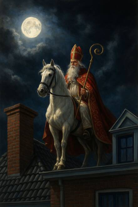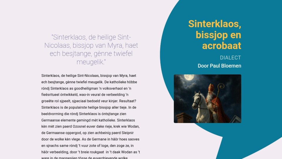 Sinterklaos, de heilige Sint-Nicolaas, bissjop van Myra, haet ech besjtange, gènne twiefel meugelik. De katholieke höbbe róndj Sinterklaos as goodheiligman ’n volksverhaol en ’n fieësritueel óntwikkeld, wao-in veural de verbeelding ’n groeëte rol sjpeelt, sjpeciaal bedoeld veur kinjer. Resultaat? Sinterklaos is de populairste heilige bissjop aller tieje. In de beeldvorming die róndj Sinterklaos is óntsjtange zien Germaanse elemente gemingd mèt katholieke. Sinterklaos kèn mèt zien paerd Ozosnel euver dake rieje, krek wie Wodan, de Germaanse oppergod, op zien achbeinig paerd Sleipnir door de wolke kèn vlege. As de Germane in häör hoes saoves en sjnachs same róndj ’t vuur zote of loge, den zoge ze, in häör verbeelding, door ’t breie roukgaat in ’t daak Wodan as ’t ware in de maonesjien tösse de euverdrievende wolke veurbierieje. Det roukgaat waerde ’n sjouw wao Pieterbaas en zien vrunj doorhaerkroepe óm de cadeaus van Sinterklaos te bezorge. Jaor nao jaor, al generaties lang riejt Sinterklaos op zien paerd, trippel trappel, trippel trap... van daak nao daak! Pieterbaas d’rachteraan, balancerend op de nokpanne mèt ‘ne zak vol cadeaus, sjouw in en sjouw oet! Acrobatiek van formaat? Of se det noe gluifs of neet, idderein is toch blie en tevreje as Sinterklaos weer good haet gereje.