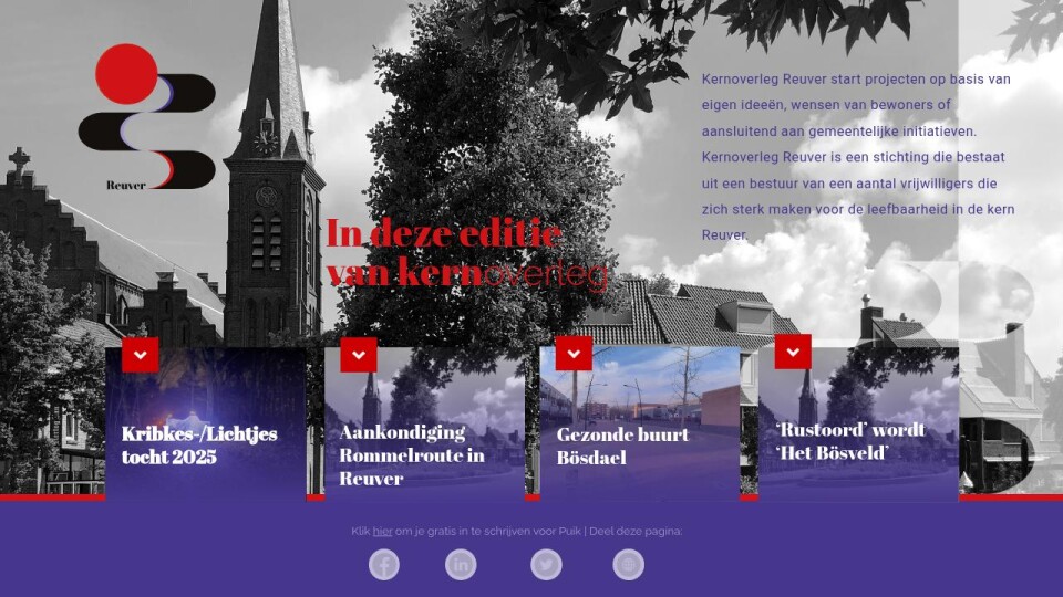 Kernoverleg Reuver start projecten op basis van eigen ideeën, wensen van bewoners of aansluitend aan gemeentelijke initiatieven. Kernoverleg Reuver is een stichting die bestaat uit een bestuur van een aantal vrijwilligers die zich sterk maken voor de leefbaarheid in de kern Reuver.