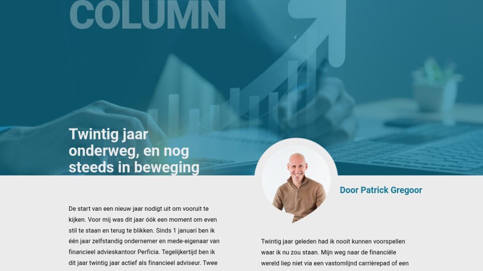 De start van een nieuw jaar nodigt uit om vooruit te kijken. Voor mij was dit jaar óók een moment om even stil te staan en terug te blikken. Sinds 1 januari ben ik één jaar zelfstandig ondernemer en mede-eigenaar van financieel advieskantoor Perficia. Tegelijkertijd ben ik dit jaar twintig jaar actief als financieel adviseur. Twee mijlpalen die automatisch zorgen voor reflectie.