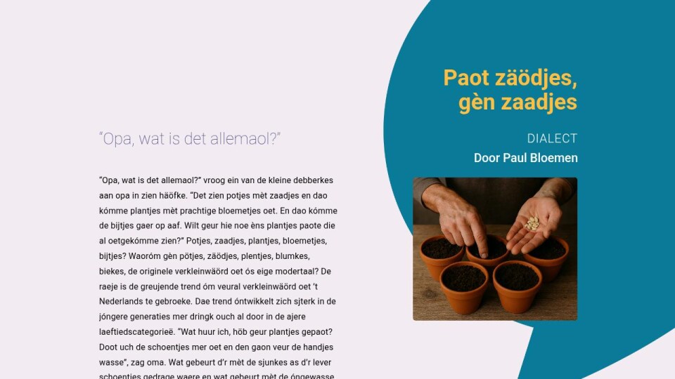 “Opa, wat is det allemaol?” vroog ein van de kleine debberkes aan opa in zien häöfke. “Det zien potjes mèt zaadjes en dao kómme plantjes mèt prachtige bloemetjes oet. En dao kómme de bijtjes gaer op aaf. Wilt geur hie noe èns plantjes paote die al oetgekómme zien?” Potjes, zaadjes, plantjes, bloemetjes, bijtjes? Waoróm gèn pötjes, zäödjes, plentjes, blumkes, biekes, de originele verkleinwäörd oet ós eige modertaal? De raeje is de greujende trend óm veural verkleinwäörd oet ’t Nederlands te gebroeke. Dae trend óntwikkelt zich sjterk in de jóngere generaties mer dringk ouch al door in de ajere laeftiedscategorieë. “Wat huur ich, höb geur plantjes gepaot? Doot uch de schoentjes mer oet en den gaon veur de handjes wasse”, zag oma. Wat gebeurt d’r mèt de sjunkes as d’r lever schoentjes gedrage waere en wat gebeurt mèt de óngewasse hendjes as de handjes veurgaon? Det mer ’n klein aantal originele verkleinwäörd oet ós modertaal door taalklimaatverangering gaon euverlaeve sjteit noe al vas. Die euverlaevingskanse höbbe veur allemaol same zèlf in de handj. De kanse beginne al aan de keuketaofel, mer as de kinjer sjtrakkes stroopje op de bótterham gaon sjmaere in plaats van kruutje den is ós modertaal ‘finito’. Veur kriege wat veur zeie, dus zei eige lokale modertaalzäödjes en gènne import.