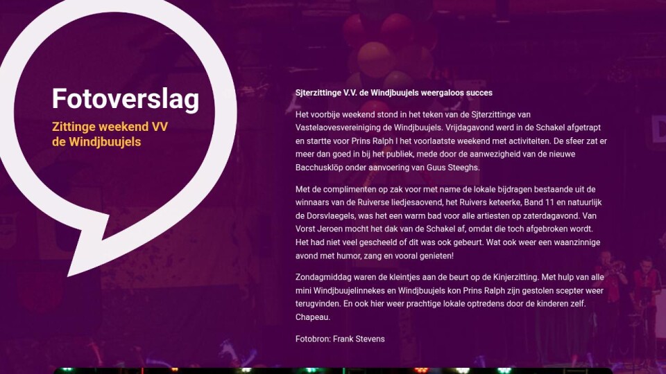 Het voorbije weekend stond in het teken van de Sjterzittinge van Vastelaovesvereiniging de Windjbuujels. Vrijdagavond werd in de Schakel afgetrapt en startte voor Prins Ralph I het voorlaatste weekend met activiteiten. De sfeer zat er meer dan goed in bij het publiek, mede door de aanwezigheid van de nieuwe Bacchusklöp onder aanvoering van Guus Steeghs.