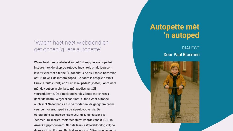 Waem haet neet wiebelend en get ónhenjig liere autopette? Intösse haet de sjtep de autoped ingehaold en de jeug geit lever wiejer mèt sjteppe. ‘Autopède’ is de aje Franse benaming oet 1918 veur de motorautoped. De naam is aafgeleid van ’t Griekse ‘autos’ (zelf) en ’t Latiense ‘pedes’ (voeten). As ’t ware mèt de veut op ’n plenkske mèt raedjes vanzèlf veuroetkómme. De sjpeelgoodversie zónger motor kreeg dezèlfde naam. Vergeliekbaar mèt ‘t Frans waar autoped ouch in ’t Nederlands en in ós modertaal de gangbare naam veur de moderautoped én de sjpeelgoodversie. De oersjprónkelike Ingelse naam veur de kinjerautoped is ‘scooter’. De ieërste ‘motorscooters’ waerde vanaaf 1910 in Amerika geproduceerd. Nao de Ieërste Waereldoorlog volgde de export nao Europa. Bekènd waar de op ’t Frans gebaseerde merknaam ‘AUTOPED’. De fabrikant waar ‘The Autoped Company of America’ in New York. De greujende vrouwe-emancipatie in de Amerikaanse samelaeving zorgde veur ‘ne extra impuls. De firma produceerde ‘n mekkelik hanteerbare en lichte autoped, compleet met ‘n benzinemeuterke det ’t veurraad aandreef. Vrouwe kóste mèt häör lange rök en jes soepel op- en aafsjtappe en vrie en ónaafhankelik euveral haer knäöre. In Nederlandj kreeg de motorautoped mer beperk ‘ne voot aan de gróndj. De kinjerautoped waerde waal erg populair en autopette ’n rage.
