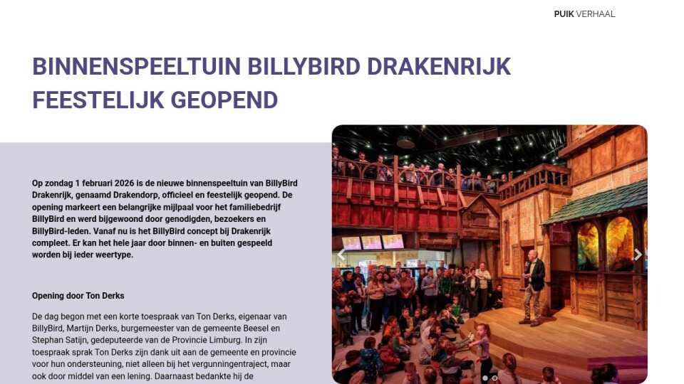 Op zondag 1 februari 2026 is de nieuwe binnenspeeltuin van BillyBird Drakenrijk, genaamd Drakendorp, officieel en feestelijk geopend. De opening markeert een belangrijke mijlpaal voor het familiebedrijf BillyBird en werd bijgewoond door genodigden, bezoekers en BillyBird-leden. Vanaf nu is het BillyBird concept bij Drakenrijk compleet. Er kan het hele jaar door binnen- en buiten gespeeld worden bij ieder weertype.
