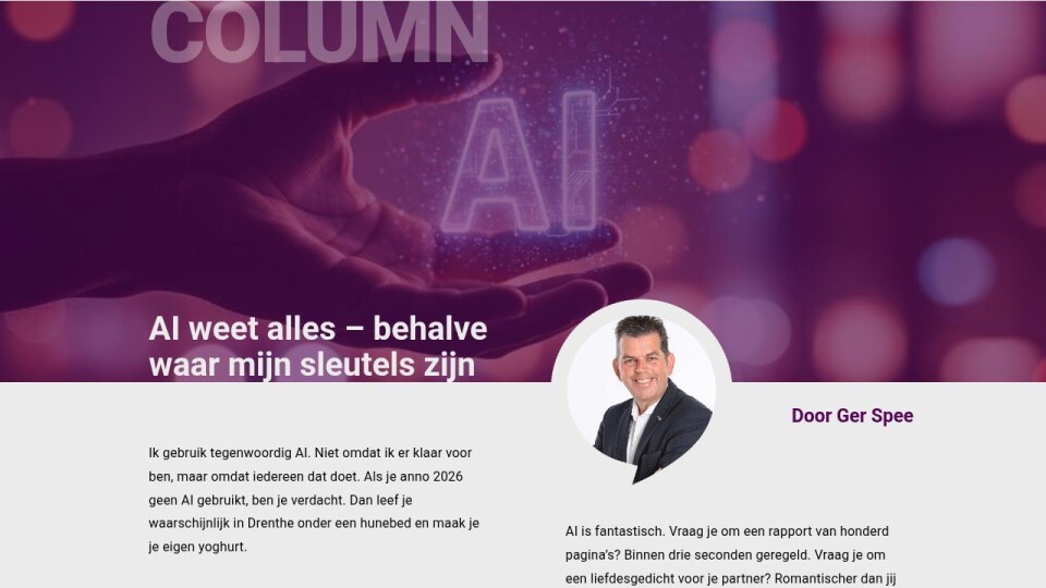Ik gebruik tegenwoordig AI. Niet omdat ik er klaar voor ben, maar omdat iedereen dat doet. Als je anno 2026 geen AI gebruikt, ben je verdacht. Dan leef je waarschijnlijk in Drenthe onder een hunebed en maak je je eigen yoghurt.
