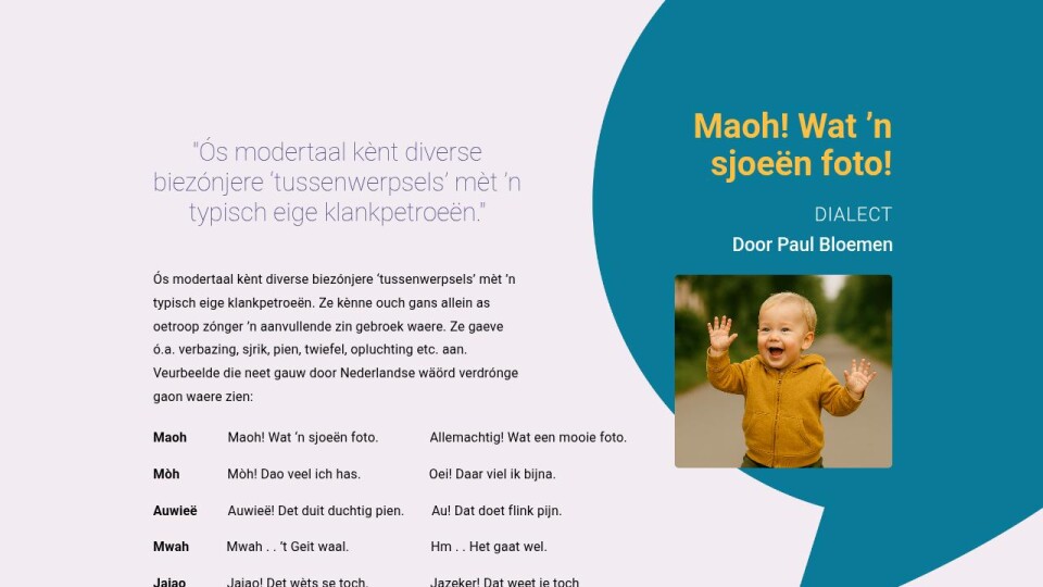 Ós modertaal kènt diverse biezónjere ‘tussenwerpsels’ mèt ’n typisch eige klankpetroeën. Ze kènne ouch gans allein as oetroop zónger ’n aanvullende zin gebroek waere. Ze gaeve ó.a. verbazing, sjrik, pien, twiefel, opluchting etc. aan. Veurbeelde die neet gauw door Nederlandse wäörd verdrónge gaon waere zien: