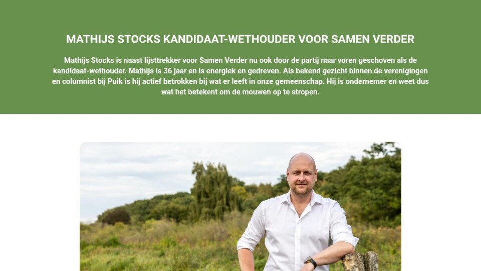 Mathijs Stocks is naast lijsttrekker voor Samen Verder nu ook door de partij naar voren geschoven als de kandidaat-wethouder. Mathijs is 36 jaar en is energiek en gedreven. Als bekend gezicht binnen de verenigingen en columnist bij Puik is hij actief betrokken bij wat er leeft in onze gemeenschap. Hij is ondernemer en weet dus wat het betekent om de mouwen op te stropen.