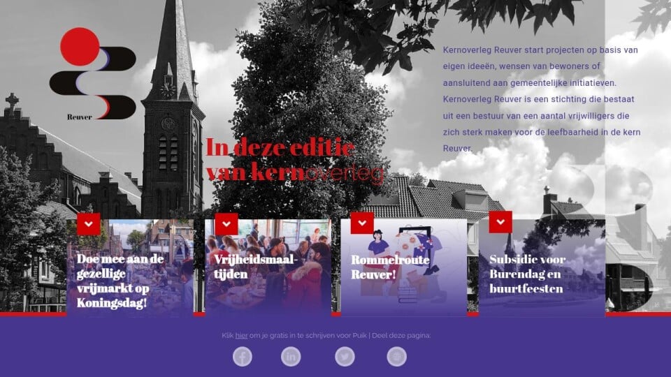 Straks liever rondstruinen en leuke spullen op de kop tikken? Dat kan uiteraard ook. Blok ‘m in je agenda: zondag 28 juni 2026! In de loop van de tijd zullen we Rommelroute Reuver onder andere via Facebook, Puik, het Ruivers Blaedje en onze site promoten.